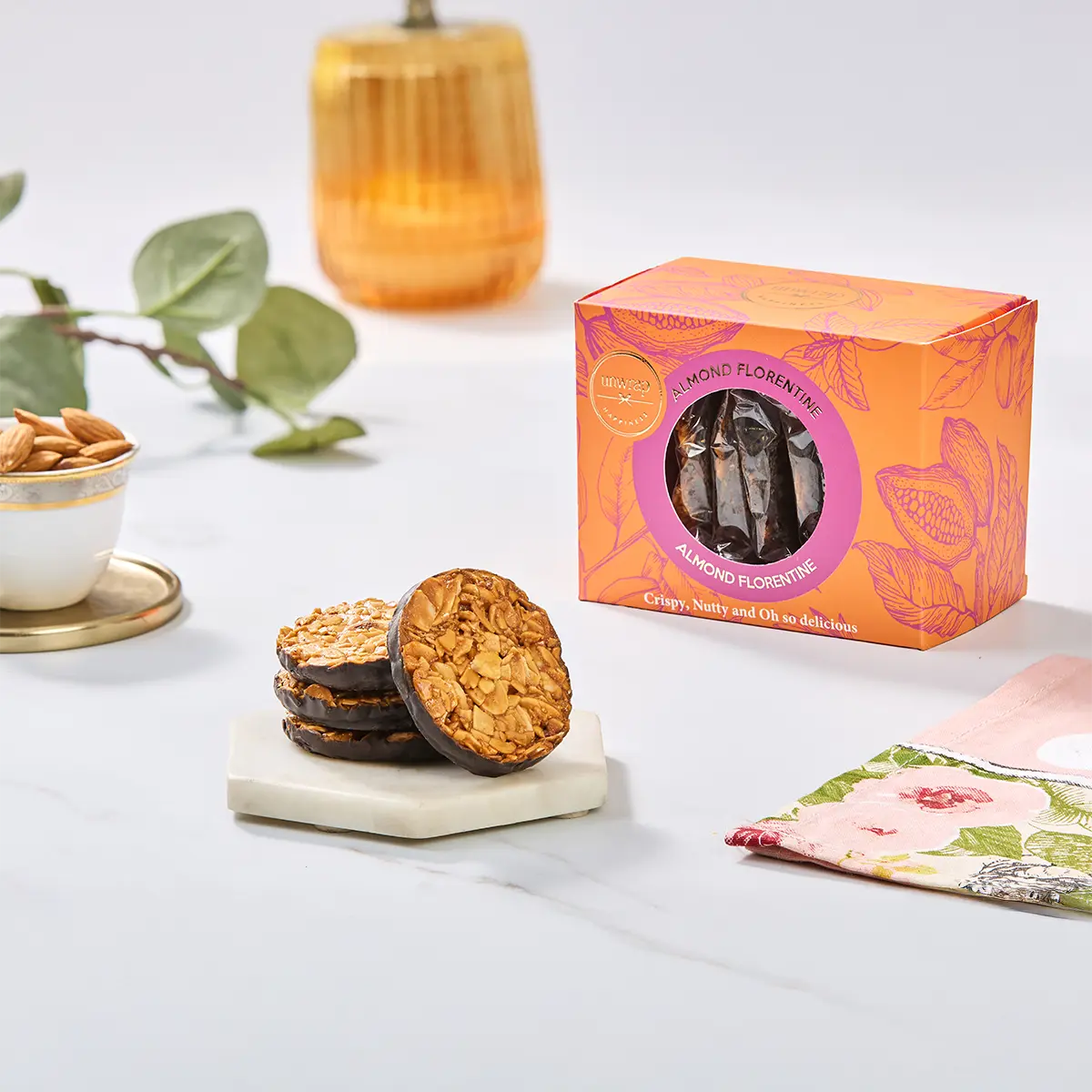 This chocolate-coated almond florentine offers a delightful crunch with a perfect balance of chocolate and caramel flavors.